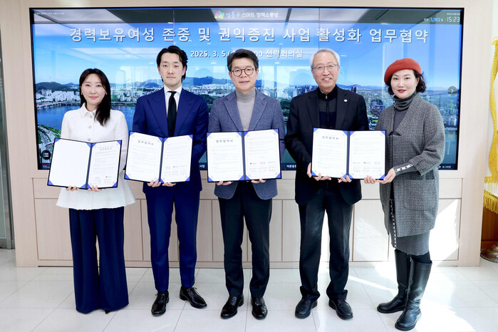정원오 구청장은 “이번 협약이 경력보유여성에 대한 긍정적 인식을 확산하고 실질적인 취·창업 기회를 확대하는 데 기여할 것으로 기대한다”며 “앞으로 기업과 지속적인 업무 협약를 통해, 경력보유여성이 능력을 마음껏 발휘하며 다양한 분야로 진출할 수 있는 정책을 적극적으로 추진할 것”고 말했다.