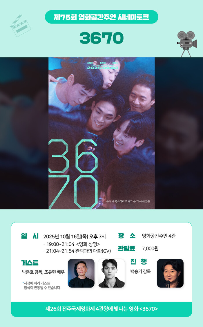 영화공간주안 관계자는 “‘3670’은 진정성 있는 서사와 배우들의 열연이 돋보이는 작품으로, 감독과 배우가 직접 참여해 관객과 생생한 대화를 나누는 뜻깊은 시간이 될 것”이라며 지역 주민들의 많은 참여를 당부했다.