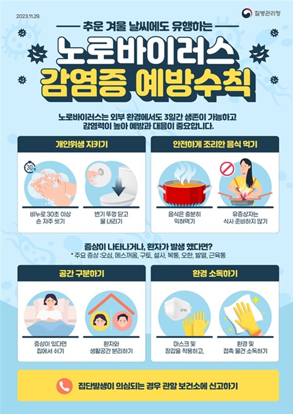 예방법으로는 △손을 씻을 때 비누를 사용해 흐르는 물에 30초 이상 손가락, 손등까지 깨끗하게 씻기 △어패류는 85℃이상에서 1분 이상 충분히 익혀 먹기 △노로바이러스 오염 가능성이 있는 지하수는 반드시 끓여 먹기 △칼·도마는 육류, 생선, 채소 등 식재료에 따라 구분해 사용하고 조리 기구는 열탕 소독하거나 기구 등의 살균 소독제로 소독 후 세척하기 △구토·설사 등 의심 증상이 있는 사람은 조리에 참여하지 않도록 하고, 증상이 회복된 후에도 2~3일 동안은 조리에서 배제하기 등이다.