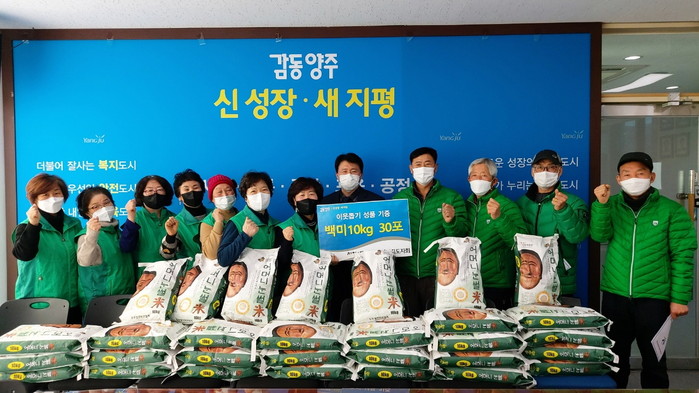 경기 양주시 회천4동 새마을남녀지도자회가 지난 21일 양주시 회천4동 행정복지센터를 방문해 백미(10kg) 30포(환가액 100만원 상당)를 기부했다. 사진은 관계자들이 기념촬영을 하는 모습. (사진제공=양주시청)