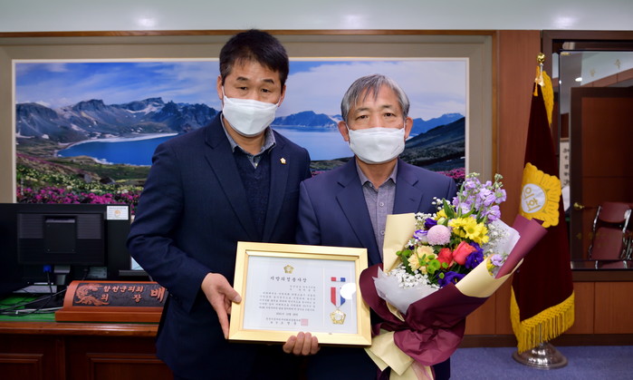 군의회 배몽희의장은 23일 오전 의장실에서 박중무의원에게 상장을 전달했다.