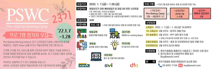 참가 신청은 구글폼을통해 신청한 후, 신청서 및 사업요약서 등 필요서류를 이메일(ksy@seoulvi.com)로 제출하면 된다. 신청 방법, 강의 일정 등 자세한 사항은 구청 홈페이지 새소식란을 참고하면 된다.