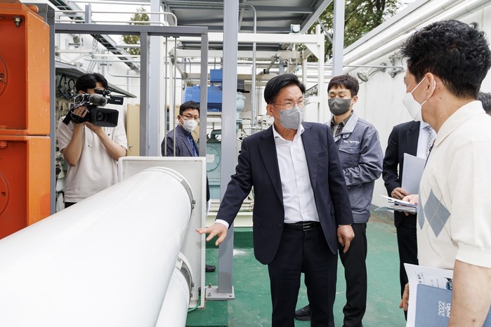 박강수 서울 마포구청장이 지난 13일 ‘상암 수소충전소’와 ‘상암 수소연료전지 발전소’ 현장을 방문해 수소생산 및 저장시설과 충전설비 등 관련 시설을 둘러보고 현장 관계자와 수소의 제조, 보관 등 안전성 문제에 대해 이야기를 나눴다. 사진은 이날 박 구청장(가운데)이 상암 수소충전소를 방문해 시설을 둘러보고 있는 모습. (사진제공=마포구청)