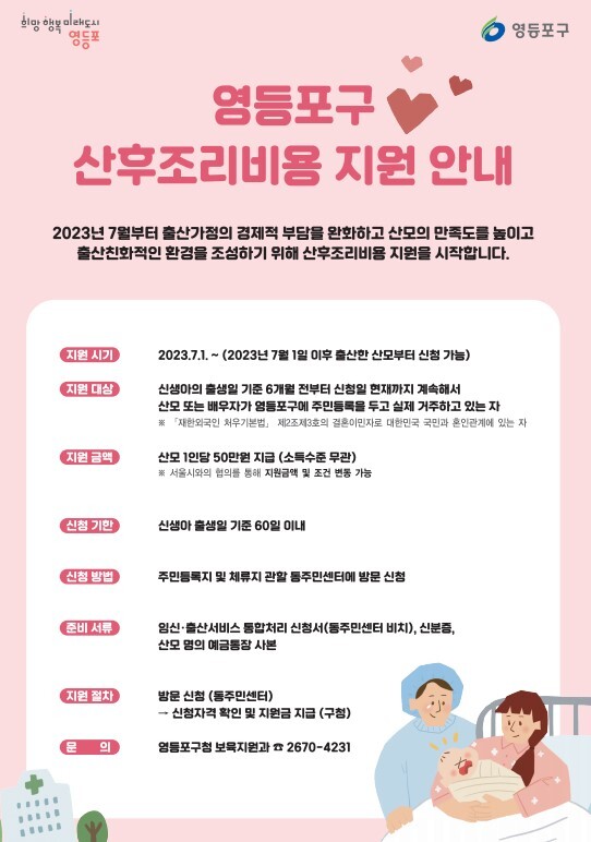 최호권 구청장은 “아이 울음소리가 소중한 요즘, 산후조리비용 지원이 출산가정에 큰 보탬이 되길 바란다”라며 “산모와 양육 가정의 눈높이에 맞춘 세심하고 다양한 정책으로 임신부터 출산, 양육까지 영등포구가 구민 곁에서 든든한 울타리가 돼 드리겠다”라고 전했다.