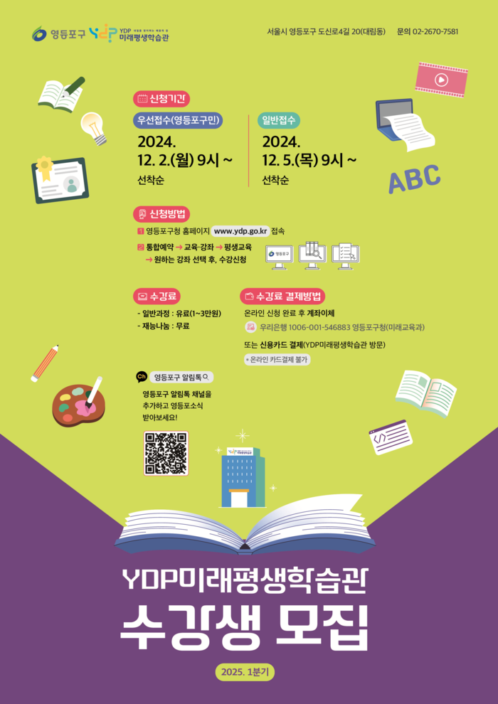 [시민일보 = 여영준 기자] 영등포구(구청장 최호권)가 구민의 배움과 성장을 지원하기 위해 YDP미래평생학습관에서 2025년 1분기 평생학습 강좌 수강생을 모집한다고 밝혔다.