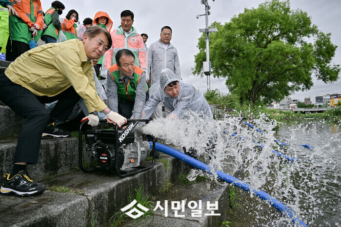 | ▲ 김이강 광주광역시 서구청장이 재난대응을 위해 민관합동 훈련에 나선 가운데 자율방재단 대상 양수펌프 가동 시범을 보이고 있다. / 서구청 제공 |