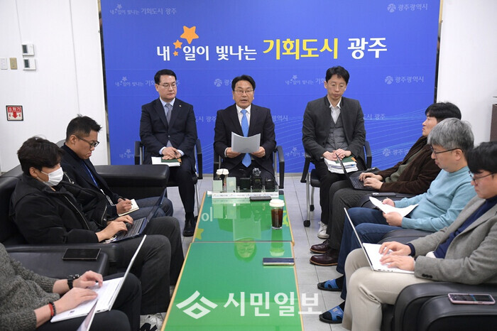 | ▲ 강기정 광주광역시장이 13일 시청 기자실에서 차담회를 열고 광주전남 행정통합 특별법과 관련 불이익배제 원칙 및 시도민 공감대 확산 방안 등을 밝히고 있다. /광주광역시 제공 |