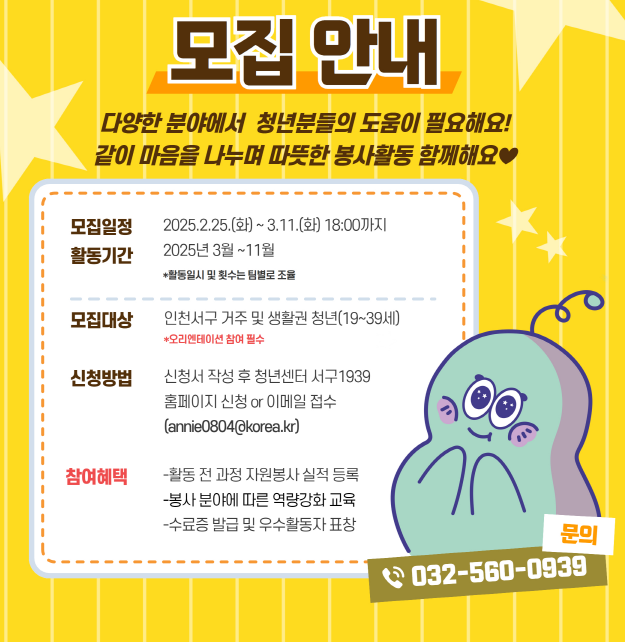 [인천=문찬식 기자] 인천 서구가 청년들이 지역사회 봉사활동에 나설 수 있도록 ‘서일삼 봉사단’을 창단, 오는 3월11일까지 참여자를 모집한다고 27일 밝혔다.