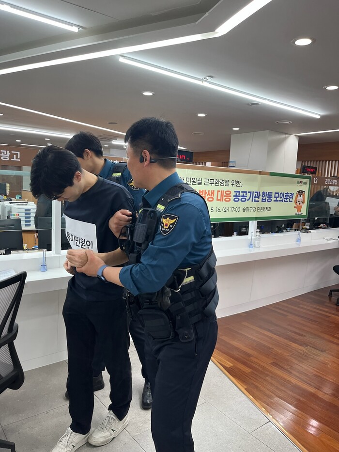 또 송파구청 민원행정과에서 민원 응대 공무원과 송파경찰서가 합동으로 '특이민원 발생 대응 모의훈련'을 실시했다. 이번 훈련은 민원인의 폭언 및 폭행 발생 상황을 가정해 특이민원인 진정유도-녹화-위협제지-경찰신고-피해공무원 보호-가해 민원인 경찰인계 순으로 진행했다.