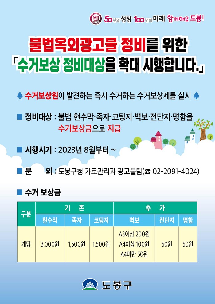 [시민일보 = 여영준 기자] 서울 도봉구(구청장 오언석)는 오는 8월부터 불법 옥외광고물 정비를 위한 수거보상제 정비대상을 확대한다고 밝혔다.