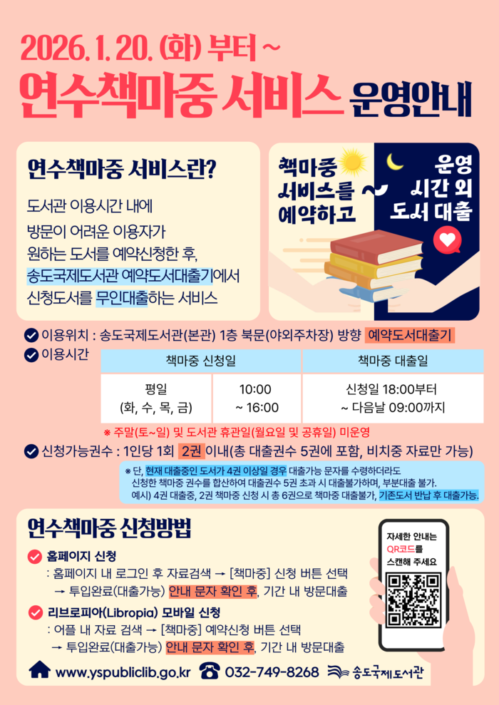 ‘연수책마중 서비스’는 송도국제도서관 1층 북문(야외주차장) 방향에 설치된 예약도서 대출기기를 통해 제공되며, 이용자는 1인당 1회 최대 2권까지 신청할 수 있다.
