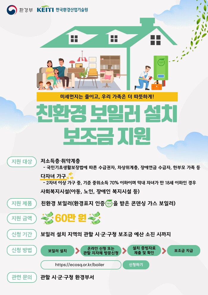 친환경 보일러는 표시 가스 소비량 70㎾ 이하인 콘덴싱 보일러로 환경표지 인증을 받은 제품을 말한다. 노후 보일러보다 대기오염물질인 질소산화물(NOx, 녹스) 배출량은 8분의 1에 불과하지만, 열효율은 12% 높아 1대당 연간 최대 44만원의 연료비를 아낄 수 있다.