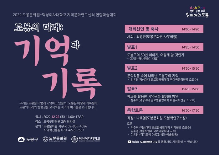 앞서 도봉문화원은 2021년 덕성여대 인문과학연구소와 학술교류 협약(MOU)를 체결한 데 이어 도봉학, 도봉문화 등과 관련해 학술적 교류를 이어오고 있다.
