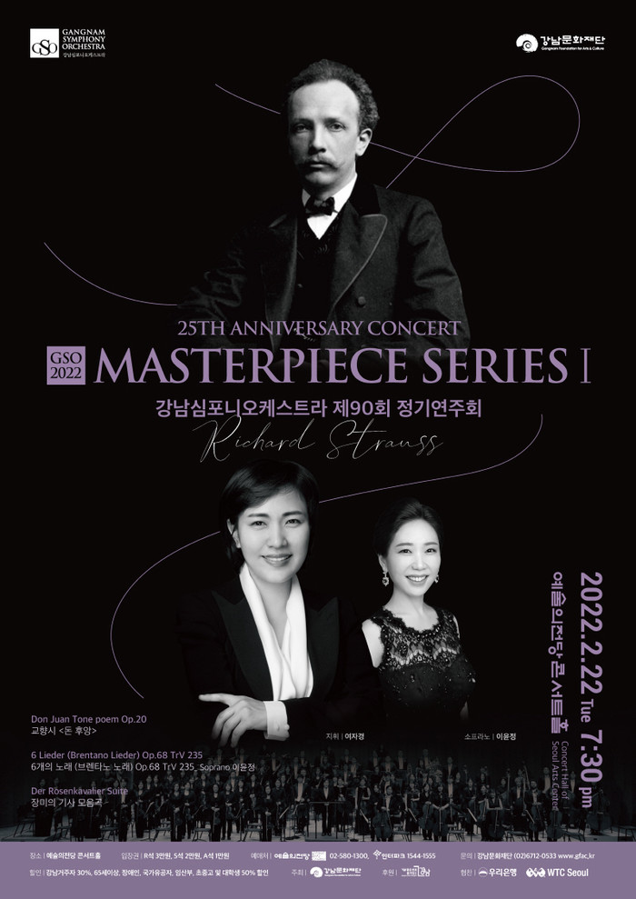 [시민일보 = 이대우 기자] 서울 강남구(구청장 정순균) 강남문화재단(이하 재단) 강남심포니오케스트라가 오는 2월22일 오후 7시30분 예술의전당 콘서트홀에서 제90회 정기연주회 '마스터피스 시리즈 Ⅰ: 리하르트 슈트라우스'를 개최한다.