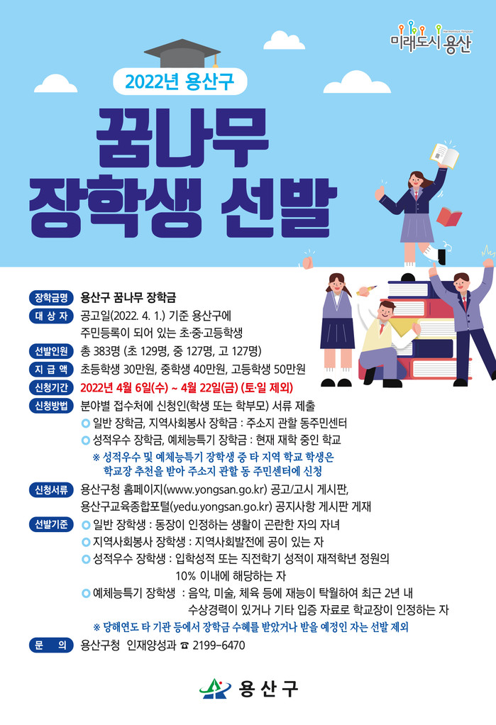 [시민일보 = 홍덕표 기자] 서울 용산구(구청장 성장현)가 미래인재 양성을 위한 '2022년 꿈나무 장학생' 383명을 선발한다.