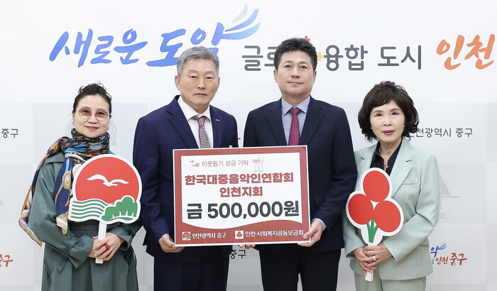 [인천=문찬식 기자] 인천 중구(구청장 김정헌)는 최근 사단법인 한국대중음악인연합회 인천지회(지회장 조한진)가 월미도 자선 공연을 통해 마련된 수익금 50만 원을 기탁했다고 밝혔다.