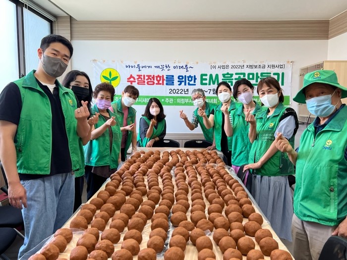 경기 의정부시 장암동 주민센터는 25일 하천 악취 제거 및 수질정화 등에 효과가 있는 EM 흙공 만들기를 실시했다. 만들어진 흙공은 발효 후 중랑천에 투하해 수질정화 활동에 활용될 예정이다. 사진은 이날 참여한 새마을부녀회 회원들이 기념촬영을 하는 모습. (사진제공=의정부시청)