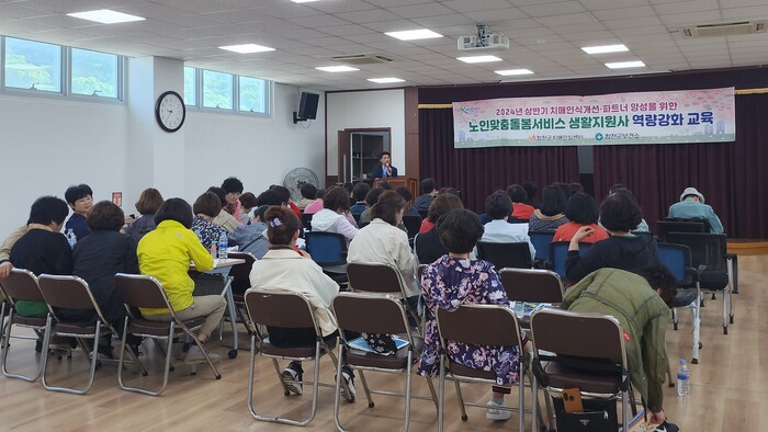 이번 교육은 합천군 치매안심센터에서 노인맞춤돌봄서비스 종사자의 전문성 증진과 역량 강화를 위해 마련됐다. 창신대학교 간호학과 오수미 교수를 초빙해 진행된 이번 교육에는 미타재가복지센터 생활지원사 43명이 참여했다. 교육은 △치매바로 알기 △치매파트너 교육 △치매 안심센터 안내 순으로 진행됐다.