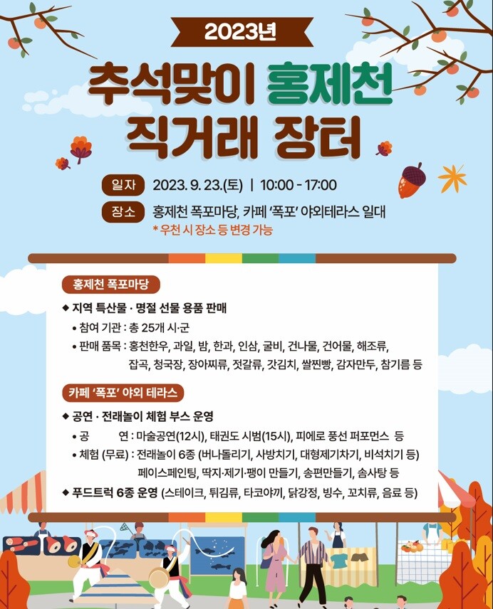 구는 오는 23일 토요일 오전 10시부터 오후 5시까지 홍제천 폭포마당과 카페 '폭포' 야외테라스 일대에서 '추석맞이 직거래장터'를 개최한다.