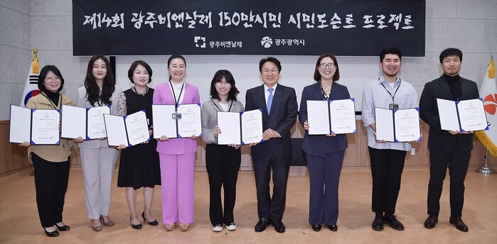이날 전달식에는 강기정 시장을 비롯해 ‘찾아오는 교육’ 수료자 정나나씨 등 9명이 참석했다. 이들 명예시민 도슨트들은 앞으로 강사양성 심화교육까지 이수하면 ‘찾아가는 비엔날레’ 강사로 활동할 수 있다.