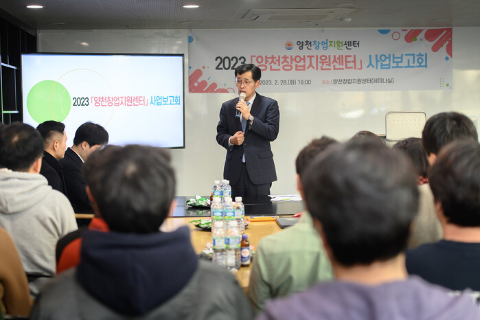 | ▲ 지난해 2월 양천구 대표 취업지원기관인 양천창업지원센터 비전보고회에서 인사말 중인 이기재 구청장. (사진=양천구청 제공) |