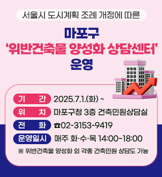 [시민일보 = 문민호 기자] 마포구(구청장 박강수)는 구민의 재산권 보호와 경제적 부담 경감을 위해 ‘위반건축물 양성화 상담센터’를 운영하고 있다고 10일 밝혔다.