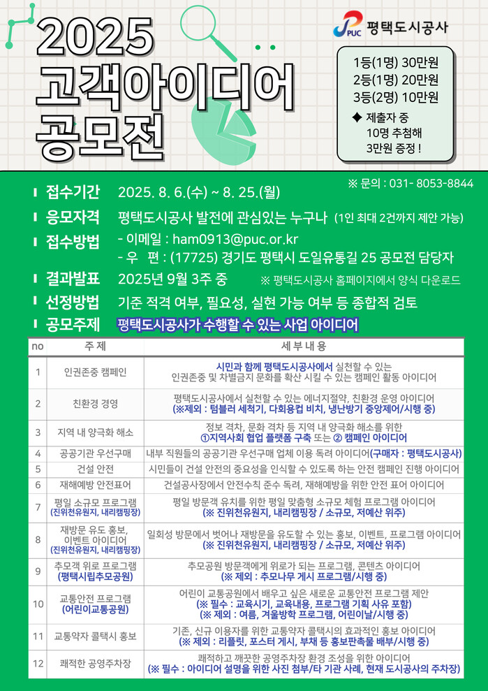 [평택=오왕석 기자] 평택도시공사(사장 강팔문)는 고객의 다양한 의견을 경영에 반영하고 시민과 함께하는 혁신을 실현하기 위해 「2025년 평택도시공사 고객 아이디어 공모전」을 개최한다고 밝혔다.