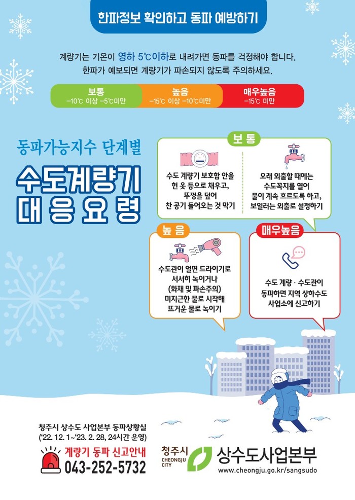 시 관계자는 “수도계량기 동파예방법을 내년 2월까지 지속적으로 홍보해 시민 피해 최소화를 위해 노력할 예정”이라고 전했다.