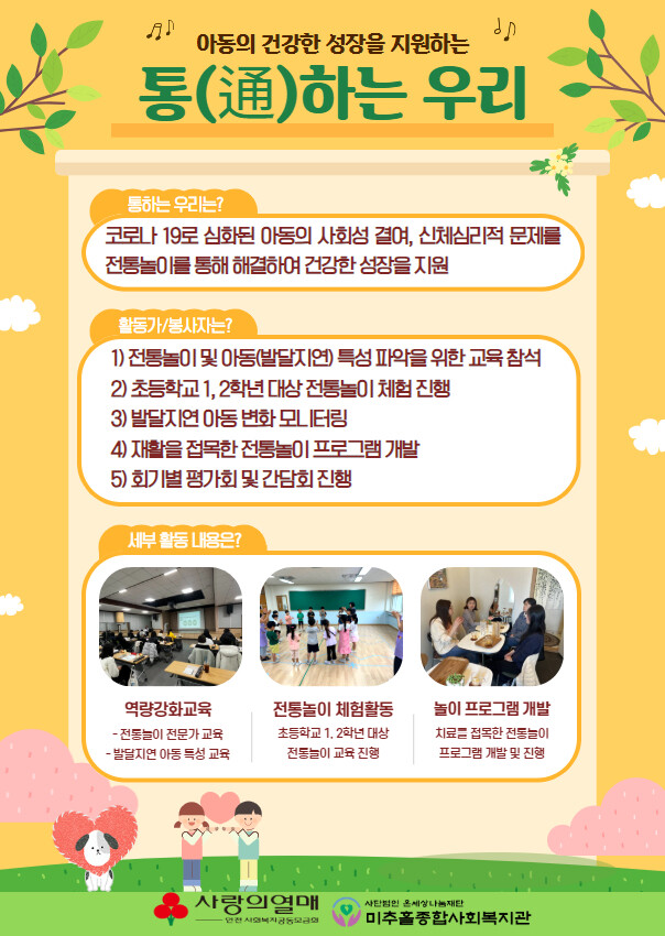 ‘통(通)하는 우리’는 코로나19로 심화된 아동의 사회성 결여와 신체·심리적 문제를 전통 놀이를 통해 해결하며 건강한 성장을 지원하는 사업이다.