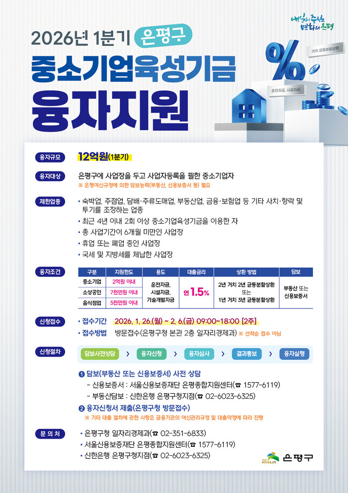 [시민일보 = 이대우 기자] 서울 은평구(구청장 김미경)가 중소기업과 소상공인의 경영 안정을 위해 총 12억원 규모의 ‘2026년 1분기 중소기업 육성기금 융자지원’ 사업을 시행한다.