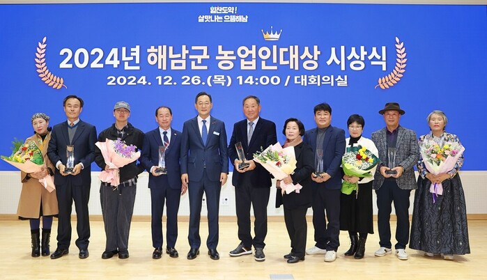 해남군 농업인대상은 읍면 및 유관기관 등 추천한 후보자들 대상으로 현지실사를 거쳐 해남군 농림축산심의회를 통해 지난 2001년부터 지난해까지 99명이 수상했다. 시상식은 26일 해남군청 대회의실에서 개최됐다.