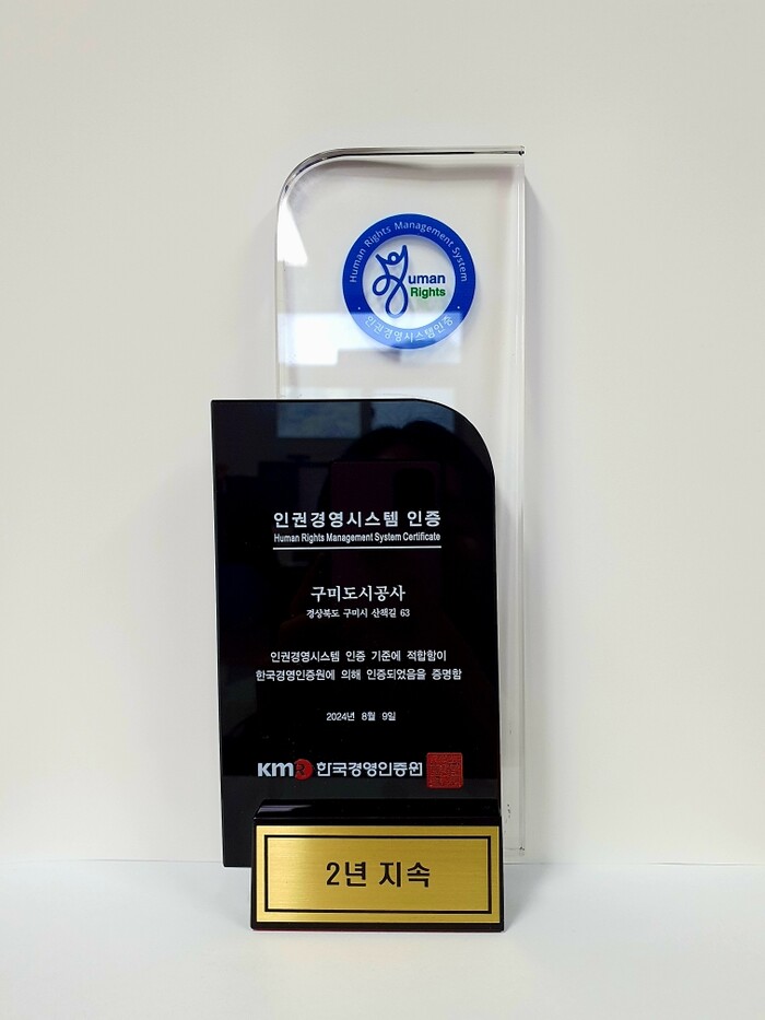 [구미=박병상 기자] 구미도시공사는 인권경영 전문 평가 기관인 한국경영인증원(KMR)으로부터 2년 연속 ‘인권경영시스템 인증’을 획득했다고 14일 밝혔다.
