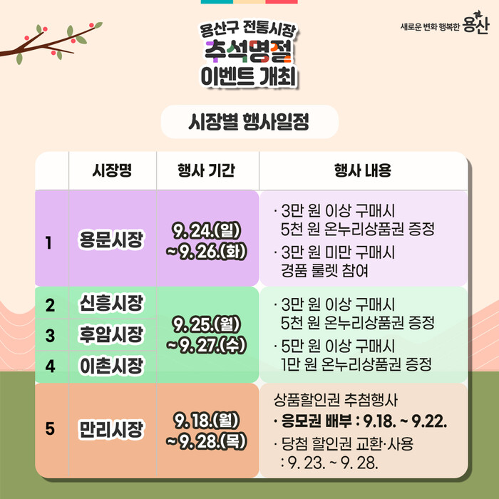 [시민일보 = 홍덕표 기자] 용산구(구청장 박희영)가 추석 명절을 맞이해 18일부터 오는 28일까지 지역내 전통시장 5곳에서 ‘추석명절 이벤트’를 연다.