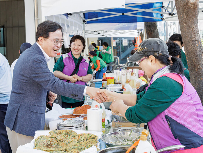 진교훈 강서구청장이 최근 화곡4동 시립화곡청소년센터에서 열린 ‘화4한 주민 축제’에 참석했다. 사진은 진 구청장(왼쪽)이 주민과 인사를 하는 모습. (사진=강서구청 제공)