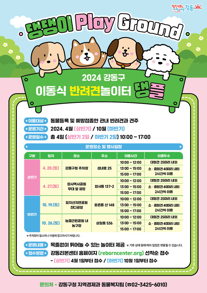 하반기에도 강동구는 반려동물 문화 활성화를 위해 이동식 반려견 놀이터를 지속 운영할 예정이며, 기타 궁금한 사항은 강동구청 홈페이지를 참조하거나 강동구청 지역경제과 또는 강동리본센터로 문의하면 된다.