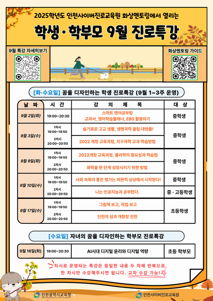 인천시교육청 관계자는 “이번 특강은 학생들에게 교과 학습을 기반으로 진로를 탐색할 기회를 제공하고, 학부모에게는 디지털 시대 자녀 교육의 방향을 고민할 수 있는 시간이 될 것”이라며 “앞으로도 학생과 학부모를 위한 맞춤형 진로 지원 프로그램을 확대해 나가겠다”고 말했다.