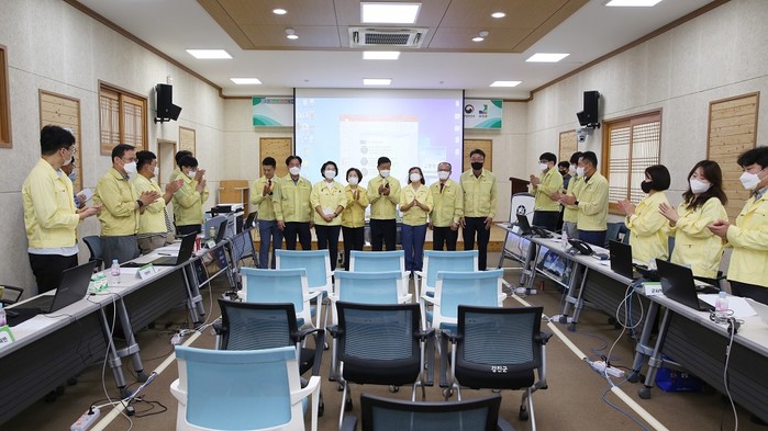 | ▲ 김보미 강진군의회 의장과 의원 일동이 25일 강진군 ‘2022 을지연습’ 훈련장인 전시종합상황실을 방문해 관계자들을 격려한 가운데 관계자들로부터 감사의 박수를 받고 있다. |