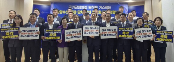 | ▲ 전남도의회 농수산위원회는 15일 도의회 브리핑룸에서 해양수산 기관·단체 부산집중화 반대 성명을 발표하고 있다.(사진=황승순 기자) |