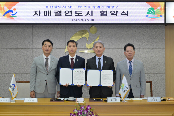 [인천=문찬식 기자] 인천광역시 계양구(구청장 윤환)는 9월 25부터 26일까지 1박 2일의 일정으로 울산광역시 남구를 방문해 두 도시 간 자매결연 협약을 체결했다고 밝혔다.