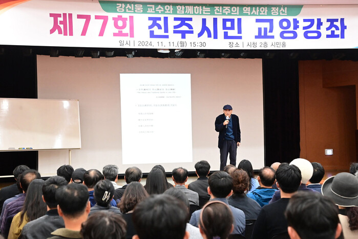 진주시는 11일 시청 시민홀에서 200여 명의 시민과 공무원이 참석한 가운데 강신웅 경상국립대 명예교수를 초청해‘진주의 역사와 정신’이라는 주제로 제77회 진주시민 교양강좌를 개최했다.