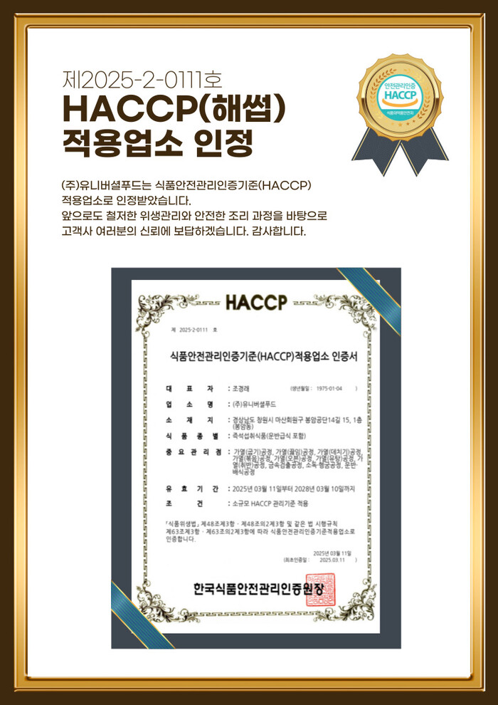 ㈜유니버셜푸드 관계자는 “이번 HACCP 인증을 통해 당사의 위생 및 식품안전 관리 능력을 공식적으로 인정받게 되었다”며 “앞으로도 철저한 관리와 차별화된 서비스로 더욱 믿을 수 있는 급식을 제공하겠다”고 전했다.