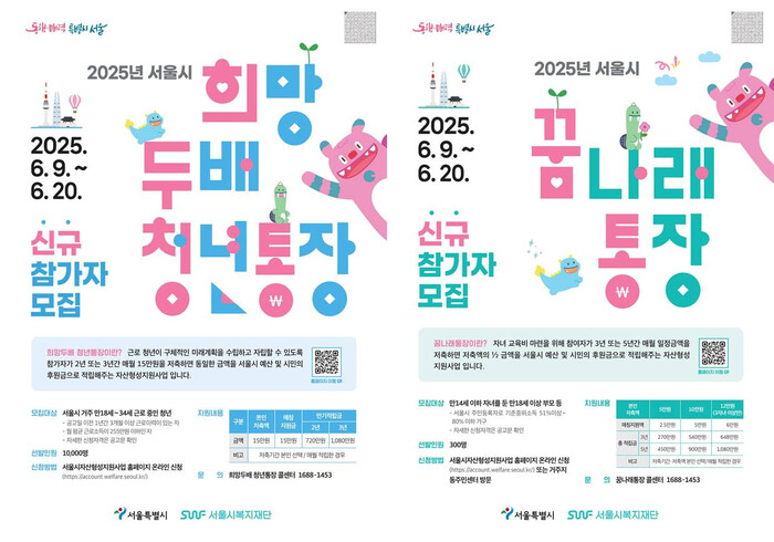 ‘희망두배 청년통장’은 서울시자산형성지원사업 홈페이지에서 온라인으로 신청하고, ‘꿈나래통장’은 서울시자산형성지원사업 홈페이지에서 온라인 신청하거나 거주지 동주민센터를 방문하면 된다.