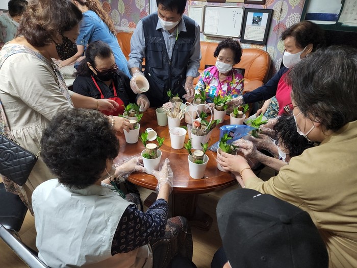 경기 의정부시 호원2동행정복지센터는 30일 지역내 경로당에 ‘찾아가는 반려식물 지원 사업’을 추진했다. 이날 호동경로당 이용 노인들이 직접 참여해 실내 공기정화와 습도조절에 도움이 되는 행운목 총 30개를 가꿔보며 뜻깊은 시간을 보냈다. 사진은 참여 노인들이 화분 식재를 하고 있는 모습. (사진제공=의정부시청)