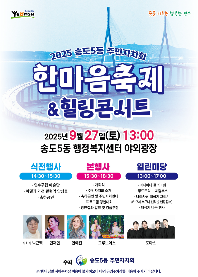 송도5동 주민자치회(회장 채한진)는 이날 송도5동 행정복지센터 야외광장에서 ‘2025 송도5동 한마음축제&힐링콘서트’를 열고 ▲아나바다 벼룩시장, ▲체험부스, ▲ 태극기 그리기 및 나눔 행사를 진행한다.