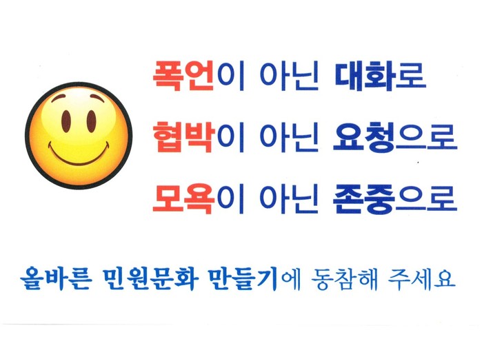 군민과 소통하며 최상의 민원서비스 제공을 위해 노력하고, 고민하는 함양군청 민원봉사과는 군민들과 가장 자주 만나는 곳으로 함양군청의 얼굴이다. 최근 민원봉사과는 올바른 민원문화를 만들기 위해, “폭언이 아닌 대화로, 협박이 아닌 요청으로, 모욕이 아닌 존중으로” 민원문화개선 스티커를 제작하여 11개읍면 민원담당부서에 부착 올바른 민원문화 만들기 홍보에 나섰다.