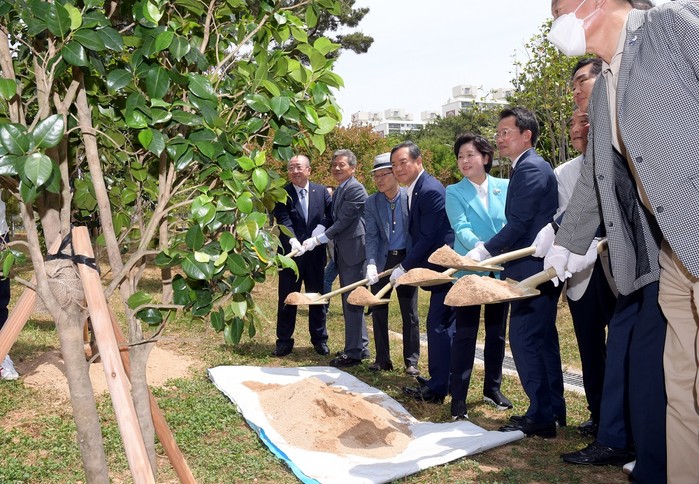 [광주=정찬남 기자] 문영훈 광주광역시 행정부시장이 4일 오전 상무시민공원에서 열린 민주평화통일자문회의 광주지역회의 한라에서 백두까지 피스로드 만들기 행사에 참석하여 참석자들과 함께 평화기념나무를 식재하고 있다. /광주광역시 제공