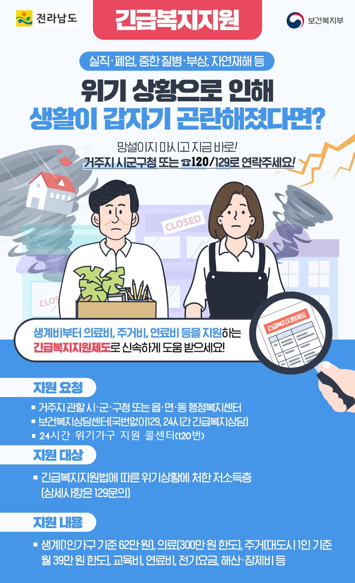 긴급복지지원은 실직, 질병 등 갑작스러운 위기 사유 발생으로 생계 유지가 곤란한 저소득층에게 긴급생계비, 주거비, 의료비 등을 신속하게 지원해 위기 상황에서 벗어나도록 돕는 제도다.