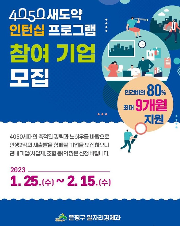 [시민일보 = 이대우 기자] 서울 은평구(구청장 김미경)가 늘어나는 40~50대 조기 퇴직·은퇴자들의 재취업을 돕기 위한 ‘4050 새도약 인턴십 프로그램’을 추진한다.
