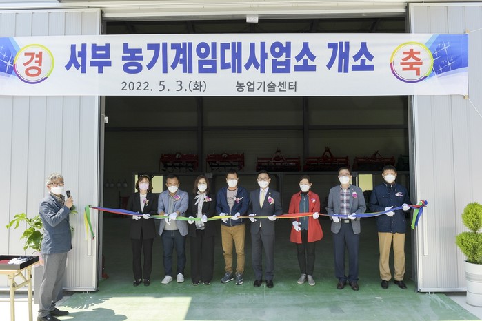 전남 순천시가 3일 외서면 화전리에 위치한 서부 농기계 임대사업소 개소식을 개최했다. 서부 농기계 임대사업소는 2763㎡ 부지에 455㎡의 창고시설 등을 갖추고 트랙터·보행관리기 등 농기계 20종·45대를 보유하고 있다. 사진은 이날 개소식에서 손점식 시장 권한대행(오른쪽 네번째)과 관계자들이 테이프 커팅을 하는 모습. (사진제공=순천시청)