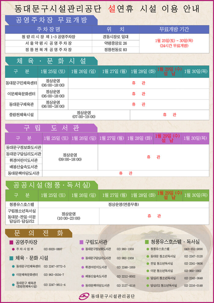 [시민일보 = 이대우 기자] 동대문구시설관리공단(이사장 인택환)이 민족 대명절인 설 연휴를 맞이하여 연휴 기간인 1월 25일(토)부터 30일(목)까지 6일간 공영주차장 무료 개방 및 공단 일부 시설을 운영한다.